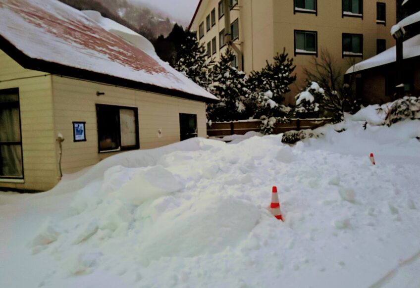 渓山亭さんの屋根と自宅の屋根から落雪がございますので 対岸のバス停側に駐車してください 日帰り駐車場には駐車しないでください 落雪によりお車が破損しても責任を負えません